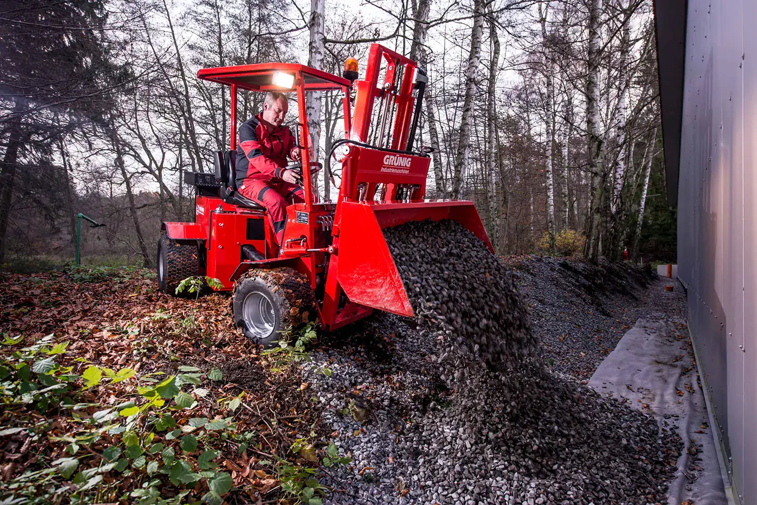 Aufgrund des geringen Eigengewichts und der speziellen Bereifung ist der Uni-Truck als Multifunktionsgerät selbst für den Einsatz auf empfindlichen Grünflächen bestens geeignet. Hier schneidet er mit einem Frontsichelmäher grosse Rasenflächen. Ebenso kann der leistungsstarke Gras- und Laubsauger am Uni-Truck das geschnittene Gras, kleine Zweige und Laub aufnehmen. Eine Unkrautbürste ergänzt durch ihren umweltfreundlichen Beitrag das gepflegte Erscheinungsbild des Geländes. Das sonst gefährliche und anstrengende Heckenschneiden erledigt der Grünig Uni-Truck sicher und schnell durch eine professionelle Anbau-Heckenschere im Frontanbau. Der Uni-Truck kann für Erdbohrarbeiten auch mit einem Anbau-Erdbohrer ausgestattet werden. Mit dem Anbau einer Schaufel erledigt der Uni-Truck als Schaufellader auch anfallende Erdaushub- und Transportarbeiten. Ebenfalls kann der Uni-Truck mit einem Anbaubagger versehen werden. Er bewältigt Transport- und Umschlagsaufgaben und ist als flinker Geländestapler für den Materialtransport von Paletten bis zu einem Gesamtgewicht von 1,2 to einsetzbar. Mit dem Uni-Truck und der hydraulischen Pflasterverlegezange im Anbau können Wege, Parkplätze oder andere Flächen zügig und akkurat verlegt werden.