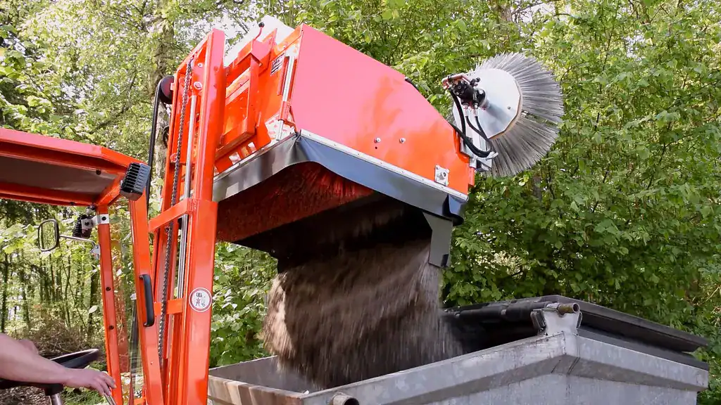 nahezu verdoppelter Füllgrad des Schmutzbehälters durch Überkopfkehrprinzip, extrem leistungsstark auch bei problematischem und großvolumigem Kehrgut wie Laub oder Papier, beinhaltet bereits die hydraulische Entleerung des Schmutzbehälters
