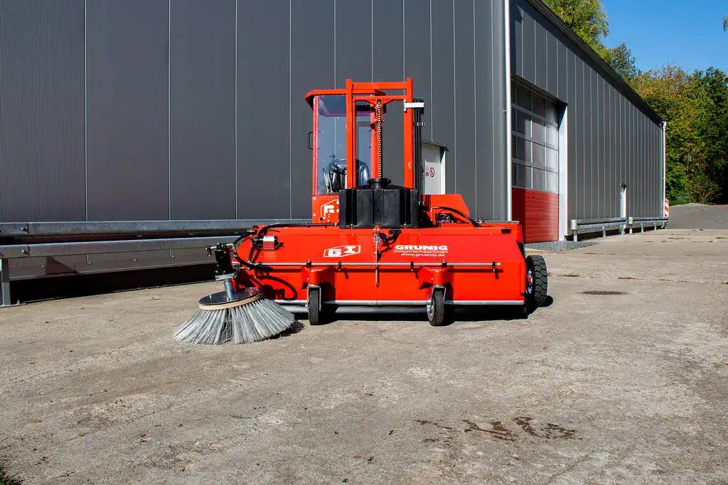 Wenn es um die die professionelle und effiziente Großflächenreinigung von öffentlichen Plätzen und Betriebsgeländen geht, machen herkömmliche Kehrmaschinen – insbesondere Kehrsaugmaschinen – dem GRÜNIG „Kehr-Fuchs“ so schnell nichts vor. Diese mit einem laufruhigen 3-Zylinder-Dieselmotor angetriebene Aufsitzkehrmaschine nimmt als Selbstfahrer Feinstäube genauso restlos auf wie große und grobförmige Schmutzbrocken. Dank der Seitenbesen werden sämtliche Ecken und Kanten mühelos ausgekehrt. Auch das Entfernen von nassem Kehrgut erledigt diese selbstfahrende Kehrmaschine zuverlässig. Selbst für die Reinigung in Bodenunebenheiten ist der Kehr-Fuchs dank pendelnder Parallelogrammaufhängung der Kehrwalze perfekt gerüstet.